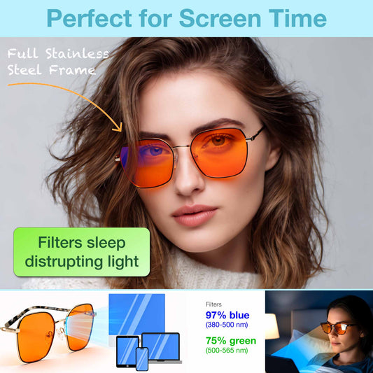 Protect your eyes and improve your sleep with THL SLEEP’s orange lens blue light glasses. They block 99.5% of blue light and 75% of green light – wavelengths that keep you awake at night.